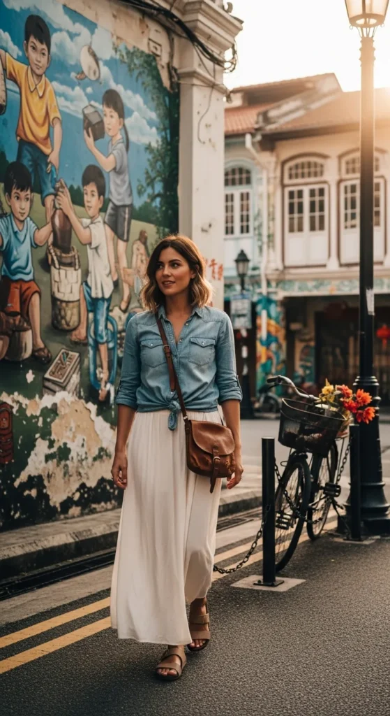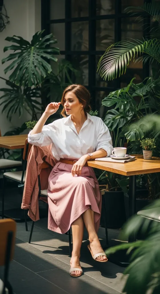 A crisp oversized cotton shirt tucked slightly into a flowy ankle-length skirt creates a refined yet relaxed silhouette perfect for city cafés or cultural sites.