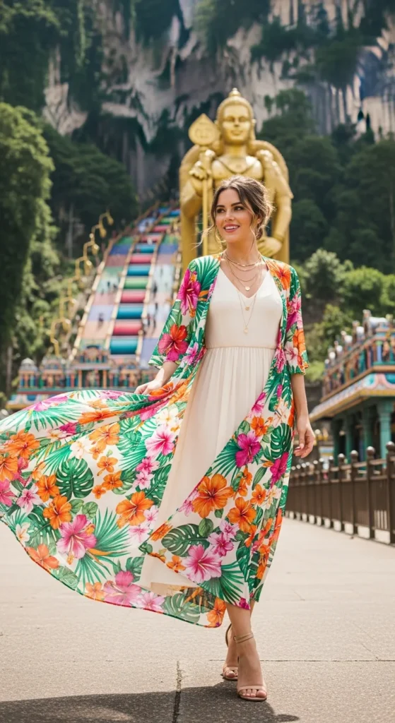 Stylist Suggestion: Choose a printed kimono with subtle tropical motifs. It reflects the Malaysian landscape and photographs beautifully against greenery and colorful street backdrops.