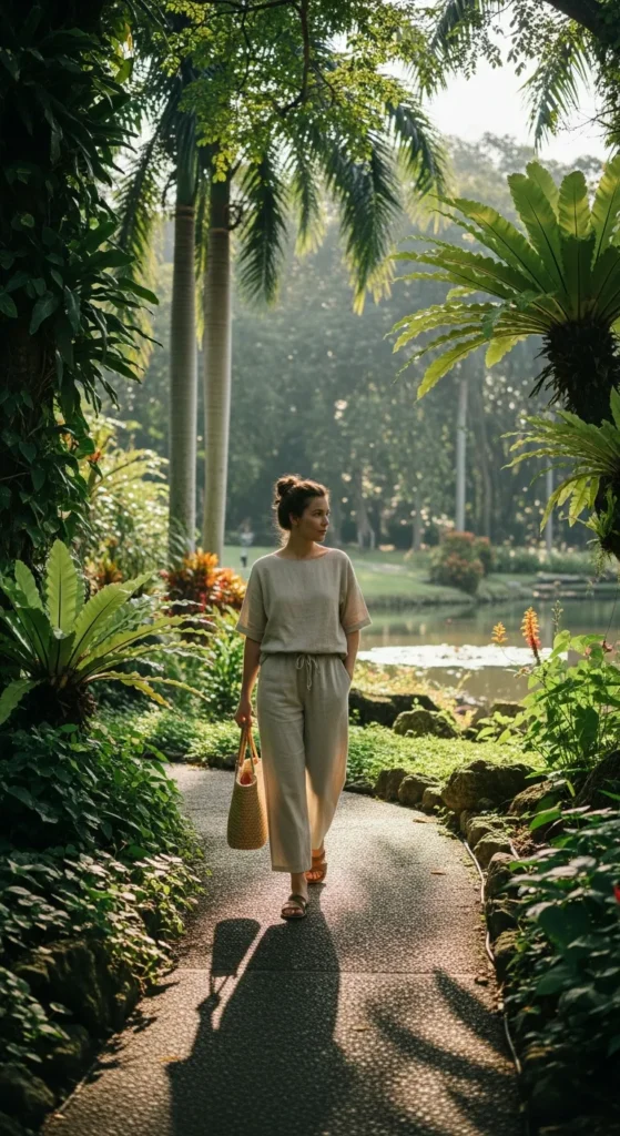A breathable linen maxi dress in a soft neutral tone keeps you cool while offering graceful coverage. The relaxed silhouette flows beautifully in tropical breezes, making it ideal for city exploring or seaside dinners.
