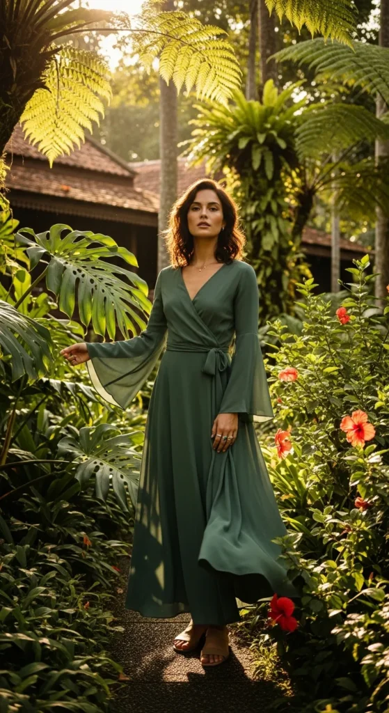 A tiered maxi dress in warm clay or olive tones feels romantic yet practical. The airy structure makes it ideal for humid days.