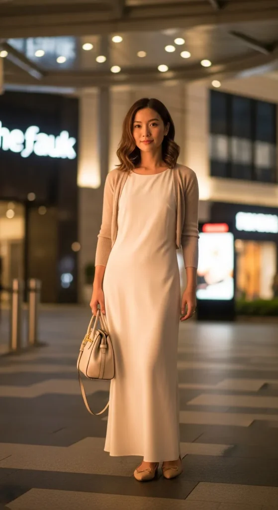 A lightweight neutral blazer layered over a maxi dress creates structured elegance for city evenings.