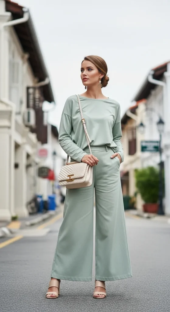 A coordinated wide-leg palazzo set in dusty lavender or sage green feels breathable yet polished. The relaxed tailoring gives movement while keeping everything modest and airy under the tropical sun.