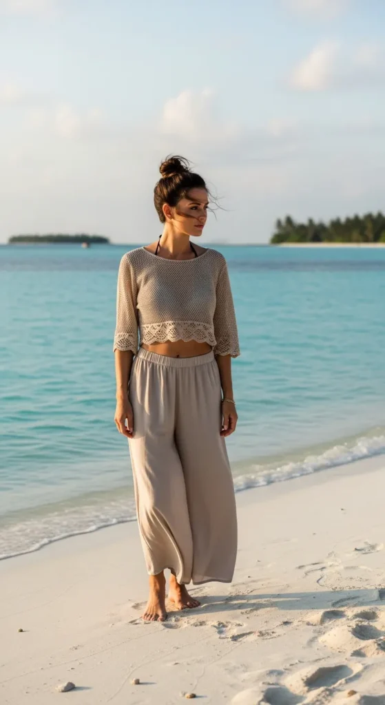 A handmade feel crochet top paired with airy palazzo pants creates texture without heaviness. It feels artisanal and relaxed, perfect for island afternoons when comfort and individuality matter more than trends.