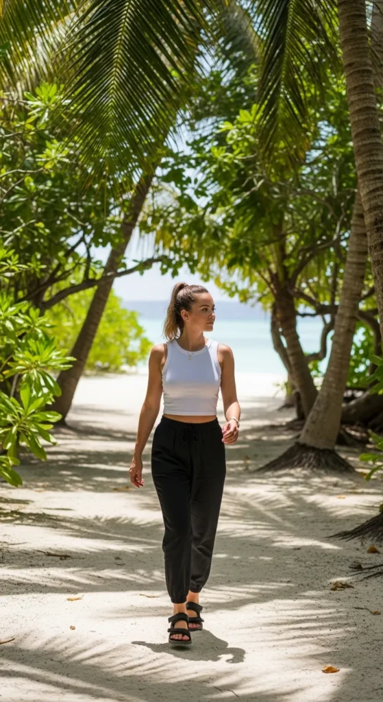 A cropped tank paired with drawstring pants feels sporty yet relaxed. It’s ideal for active days without sacrificing a put-together appearance.