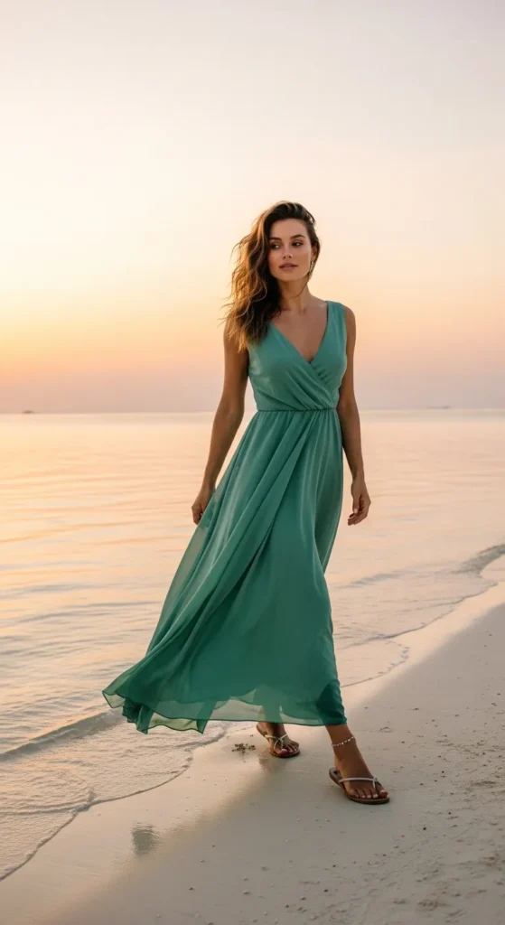 A lightweight maxi dress in seafoam green moves beautifully with ocean breezes, creating a dreamy silhouette that feels romantic yet effortless. Perfect for sunset walks where comfort and elegance naturally blend together.