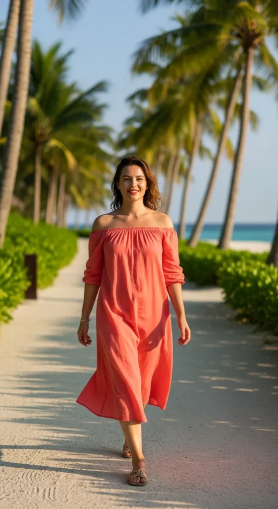 An off-shoulder cotton dress in a warm coral shade feels cheerful and vacation-ready. The breathable fabric and relaxed fit make it ideal for daytime exploring or casual island dinners.