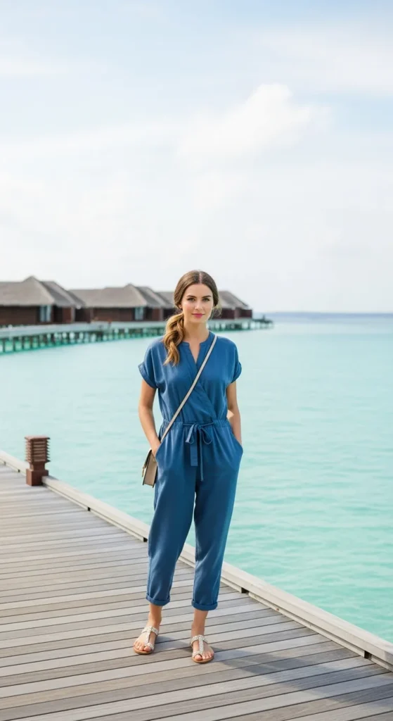 A loose-fit jumpsuit in ocean blue offers one piece ease with visual impact. It’s comfortable, flattering, and ideal for travelers who want simplicity without sacrificing style.