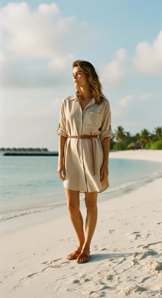 A loose button down shirt dress in a sandy neutral shade feels timeless and breathable. It’s the kind of outfit that looks equally good barefoot on the beach or styled up for lunch.