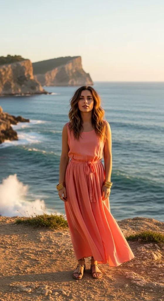 A soft coral cotton maxi dress glows beautifully against Mallorca’s golden sunsets, offering both elegance and comfort.