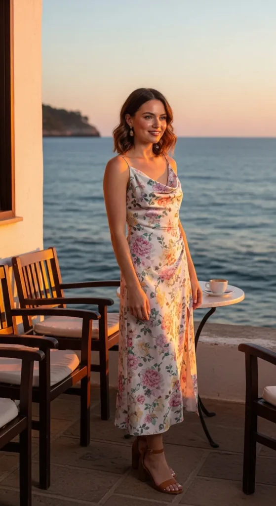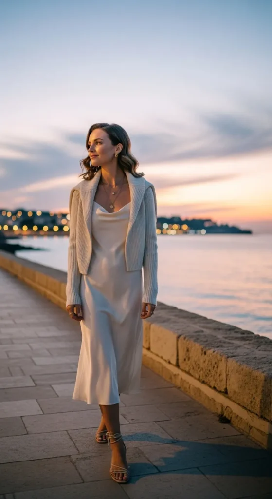 A breathable slip dress layered with a lightweight cardigan is perfect for breezy coastal evenings.