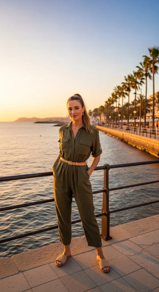 An olive green lightweight jumpsuit offers comfort and subtle drama, especially against Mallorca’s bright blue waters.