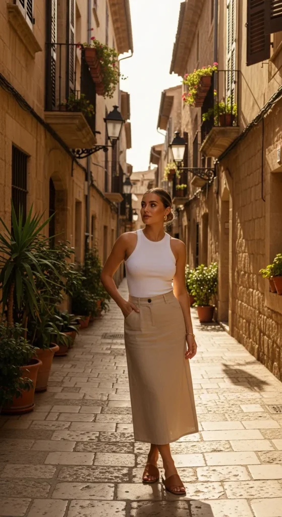 A high-waisted sand-toned linen midi skirt paired with a fitted ribbed tank creates a soft silhouette that feels both feminine and practical for exploring old stone towns.