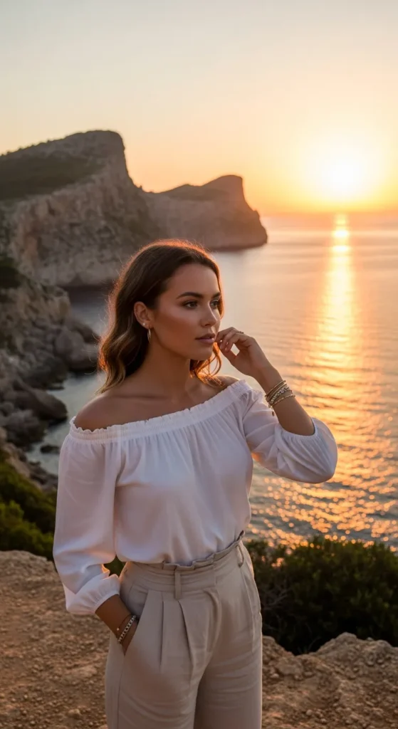 An off-shoulder white blouse styled with loose linen trousers feels breezy and feminine for sunset viewpoints.