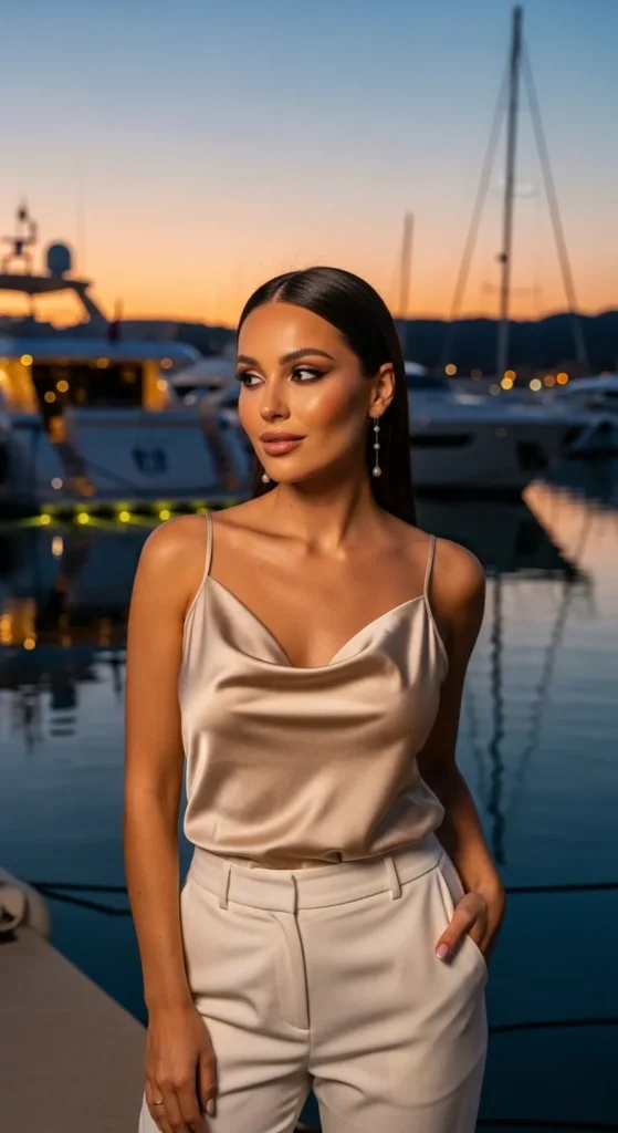 A soft satin camisole paired with relaxed trousers transitions effortlessly into evening dinners by the marina.