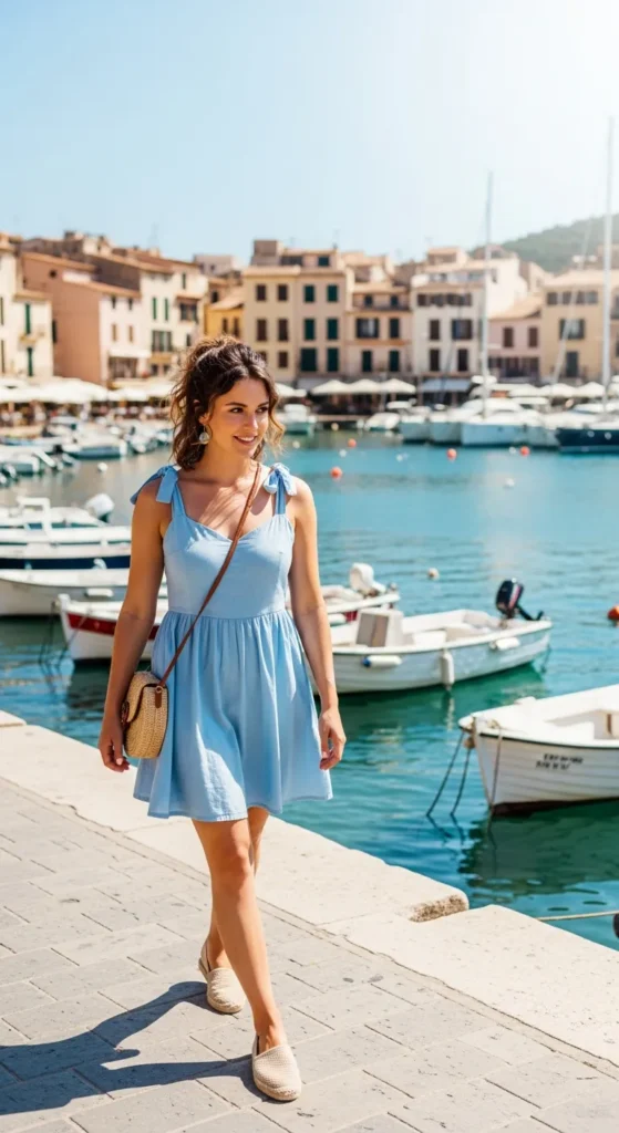 A soft sky-blue cotton sundress with tie-up shoulder straps feels playful and airy. The lightweight fabric moves gently with every coastal breeze, making it perfect for harbor strolls and gelato stops.