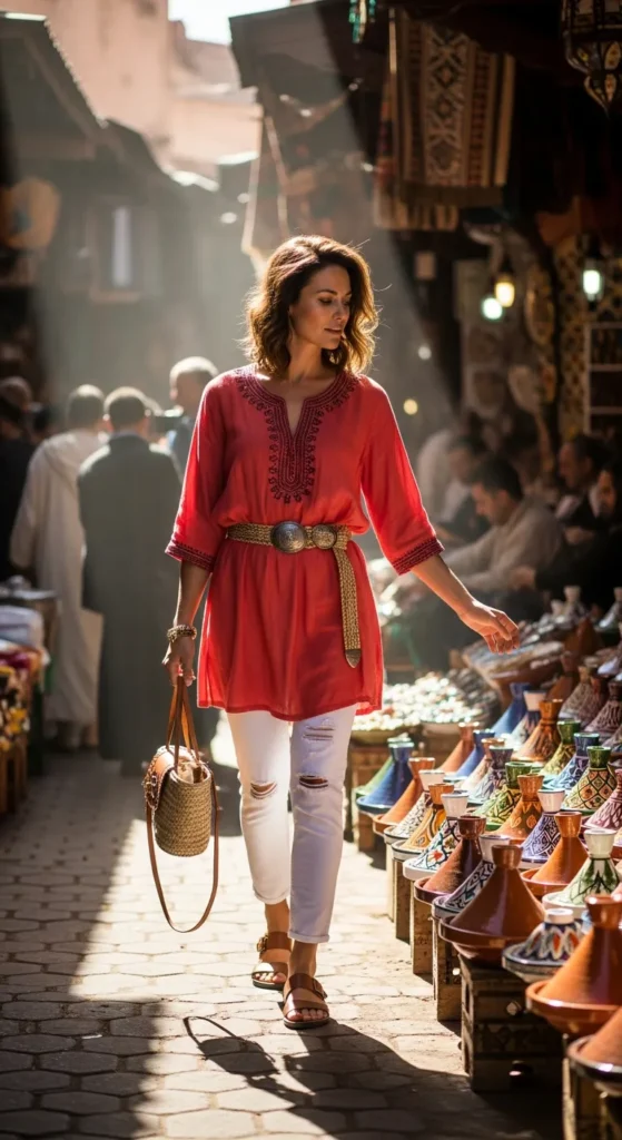 A coral tunic over relaxed white denim feels fresh and clean against Marrakech’s earthy tones.