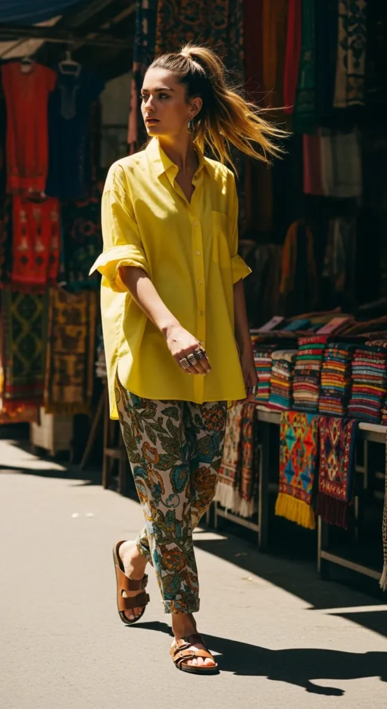 A lemon yellow oversized button-up tucked into patterned Moroccan-inspired trousers feels bright and joyful without being loud.