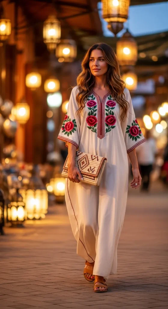 A soft rose-colored kaftan with subtle embroidery glides effortlessly through busy lanes. It’s comfortable, breathable, and blends beautifully with Marrakech’s romantic color palette.