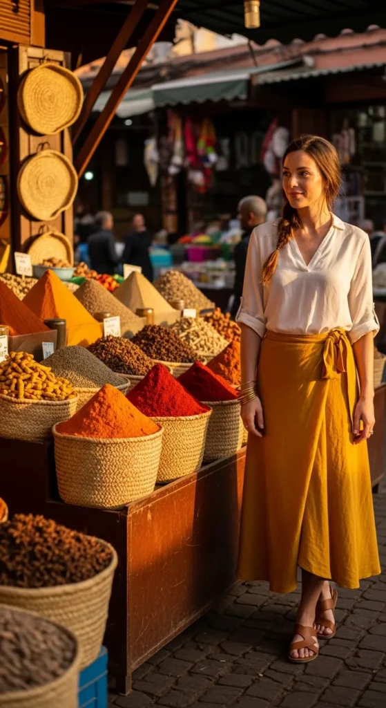 A saffron midi wrap skirt paired with a soft ivory tucked-in blouse feels playful yet refined. The warm hue mirrors the spices stacked high in the market stalls.