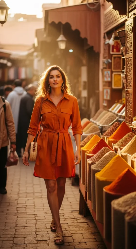 A flowy tangerine cotton shirt dress with rolled sleeves and a softly cinched waist feels fresh against Marrakech’s terracotta walls. Light, breathable, and striking without trying too hard, it’s perfect for long market strolls.