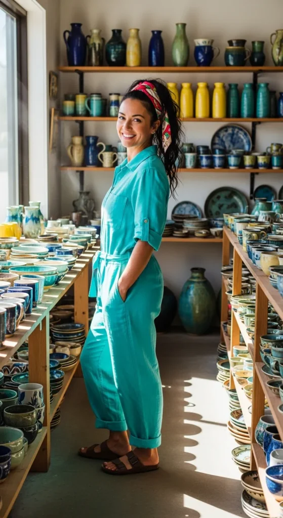 A sleeveless turquoise linen jumpsuit feels vibrant and practical. The one-piece design keeps things easy during long shopping hours.
