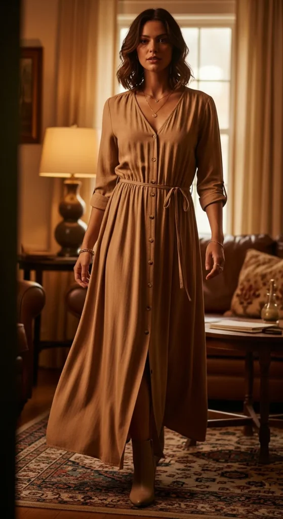 A buttoned maxi dress with a built-in waist tie feels effortless and flattering. The flowy fabric moves gently, making it perfect for winter days that need comfort with style.