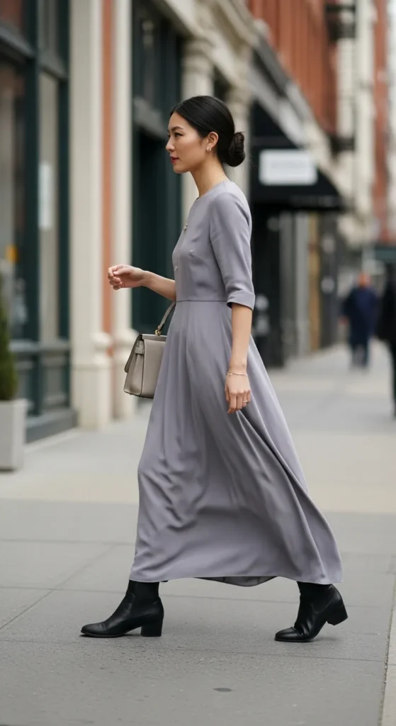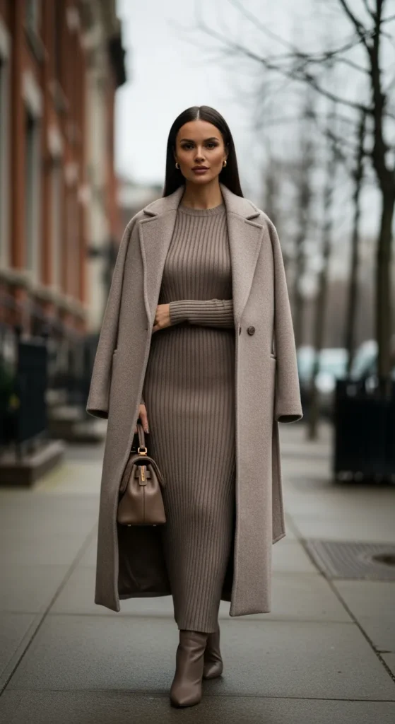 A ribbed maxi dress in one winter-friendly shade feels quietly powerful. When paired with a long coat in the same tone, the look feels elevated, intentional, and incredibly easy to wear.