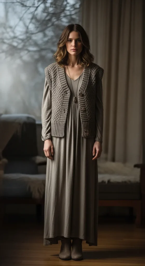 A textured vest layered over a flowy maxi adds warmth and visual depth. This outfit feels creative and personal, perfect for winter days when you want something different.
