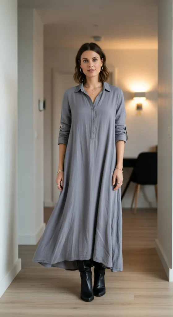 A button-down shirt maxi dress feels relaxed yet confident in winter. Its fluid silhouette pairs beautifully with tall boots, creating a look that’s both practical and stylish without extra effort.