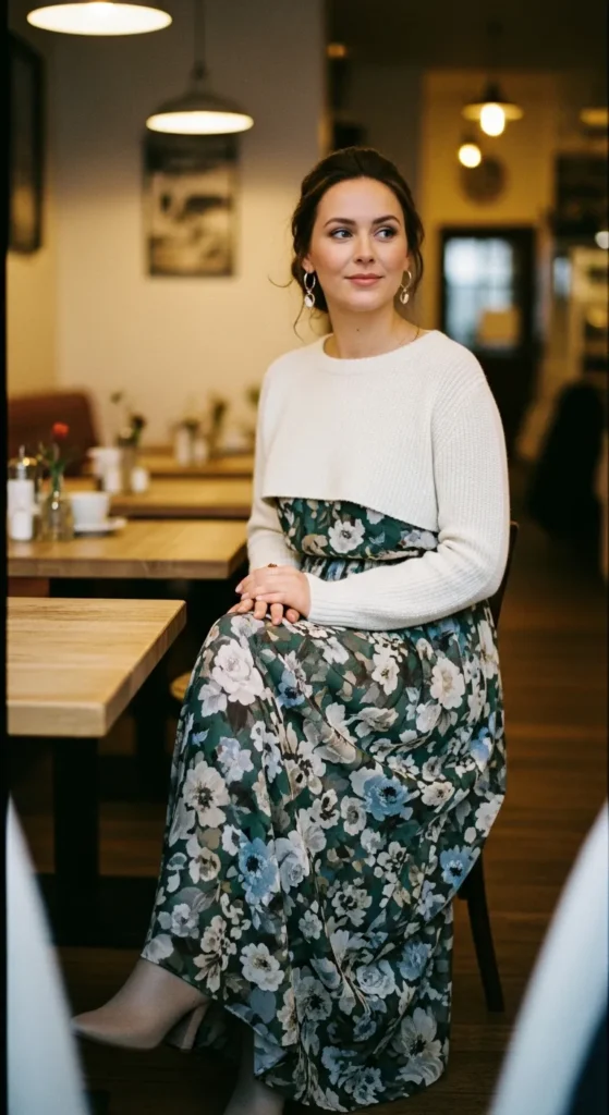A lightweight printed maxi paired with a cropped sweater feels playful and effortless. The contrast between flow and structure gives this outfit an easy layered charm that works for everyday winter moments.