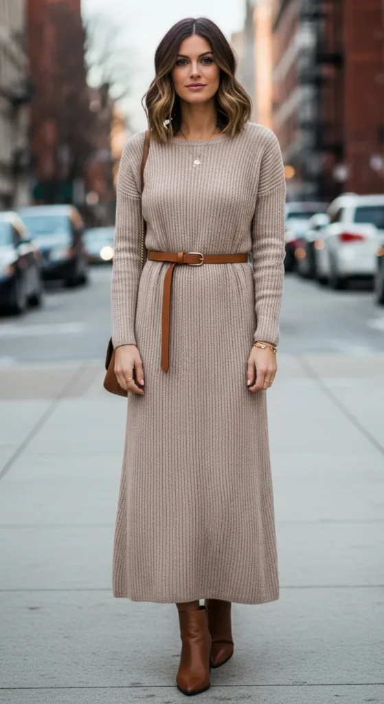 A gently draped knit maxi cinched loosely at the waist creates a calm, put-together feel. It moves beautifully when you walk and feels cozy enough for long winter days without looking bulky.