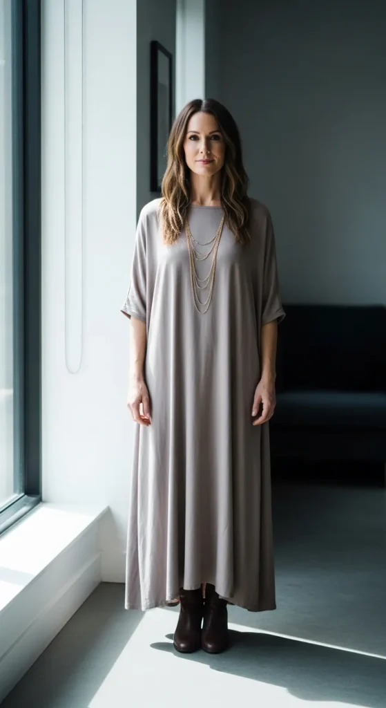 A soft neutral maxi dress acts as the perfect base for winter styling. Adding layered necklaces brings personality while keeping the overall look calm and wearable.