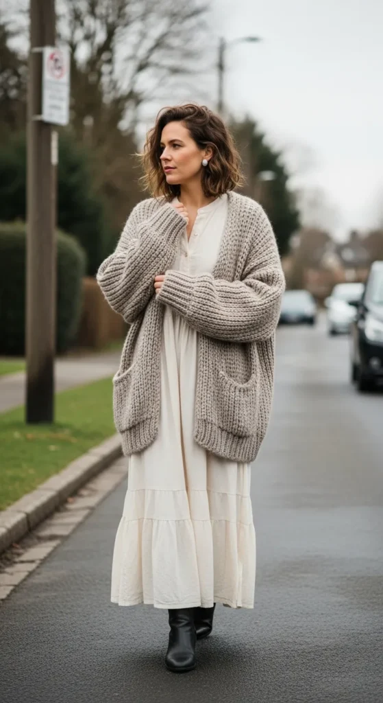 Stylist Suggestion: Let the cardigan stay slightly oversized and add ankle boots with a solid sole. The contrast balances the dress’s volume and keeps the look grounded.