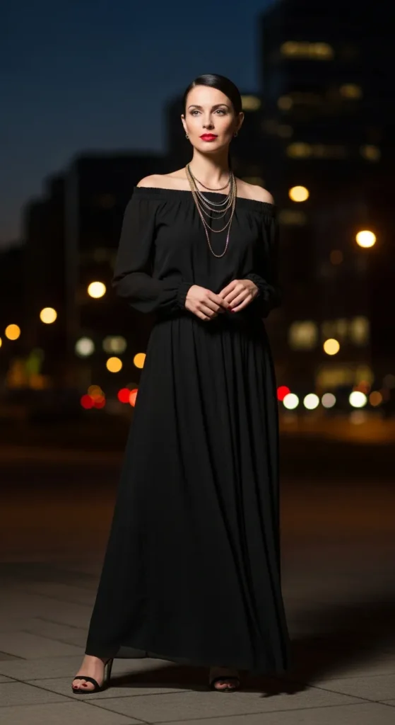 A flowing black maxi skirt matched with an off-shoulder blouse creates a striking yet simple look. The exposed neckline adds softness while the dark base keeps it sophisticated and versatile.