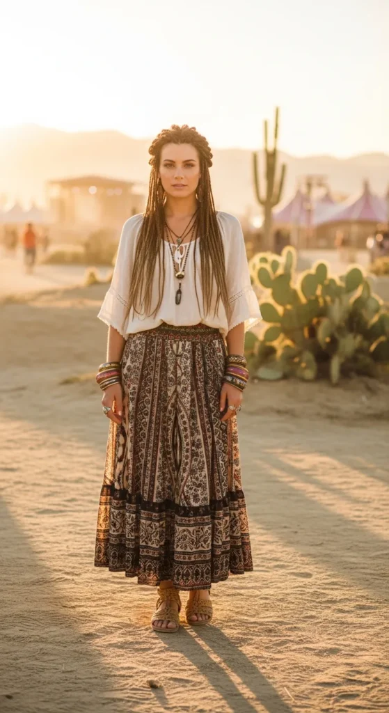 A bohemian-style maxi skirt styled with a flowy peasant top feels relaxed and artistic. The textures and movement create a free-spirited, expressive outfit.