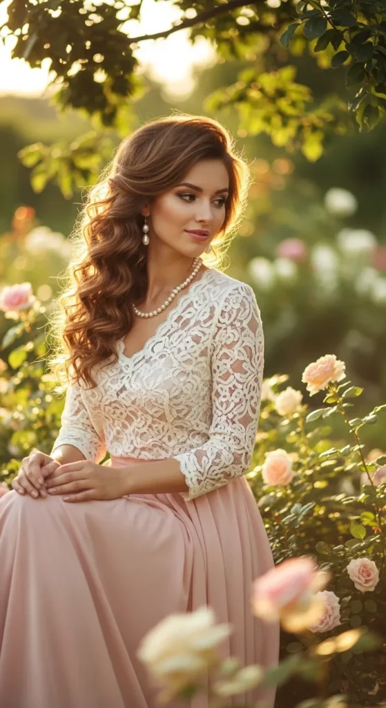 Stylist Suggestion: Wear soft curls and pearl accessories. These details echo the softness of the outfit and complete the romantic feel.