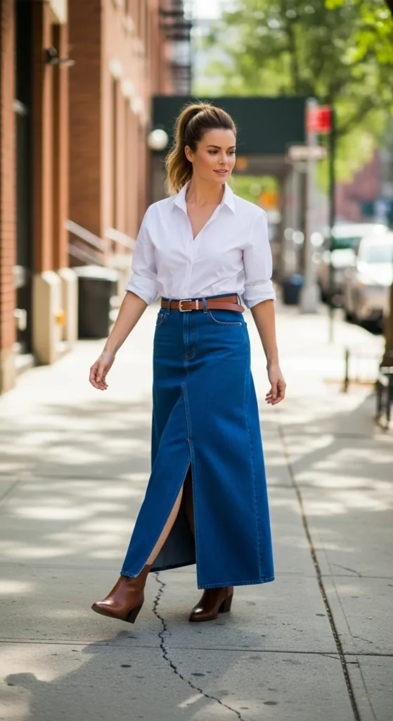 A structured denim maxi skirt styled with a crisp white shirt feels timeless yet modern. It’s a dependable combination that works across seasons while offering a clean, effortless vibe.