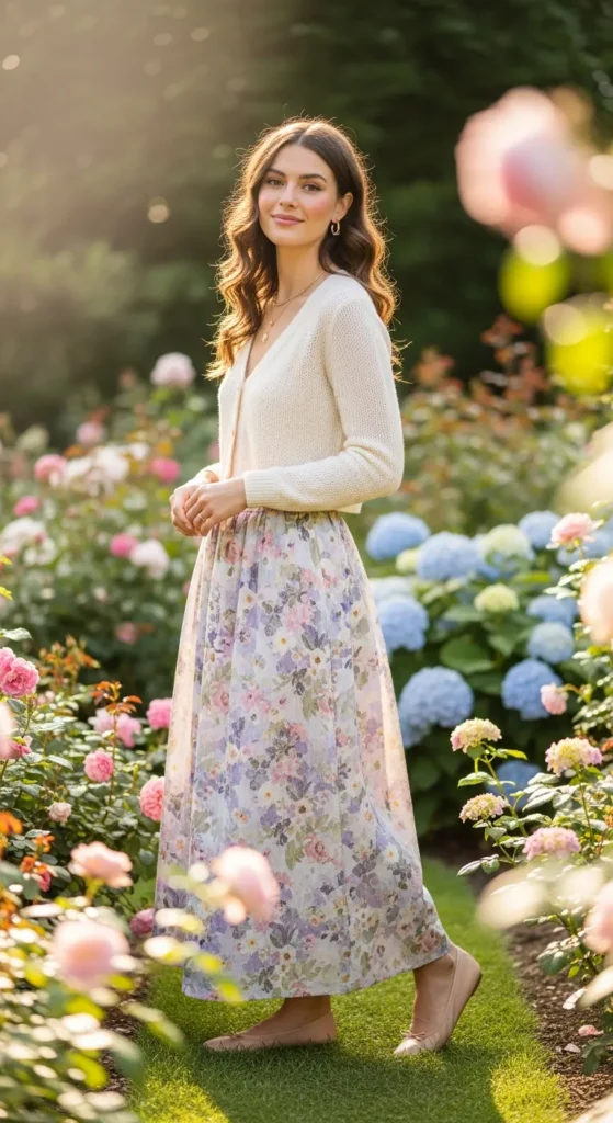A delicate floral maxi skirt styled with a lightweight cropped cardigan feels romantic and softly feminine. It’s perfect for transitional weather, offering just enough warmth while keeping the outfit light and graceful.