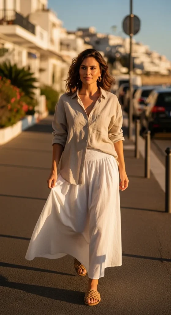 A breezy white maxi skirt paired with a slightly oversized linen button-down creates a soft, airy silhouette that feels fresh and relaxed. The look moves beautifully in warm weather while maintaining a polished, minimal charm.