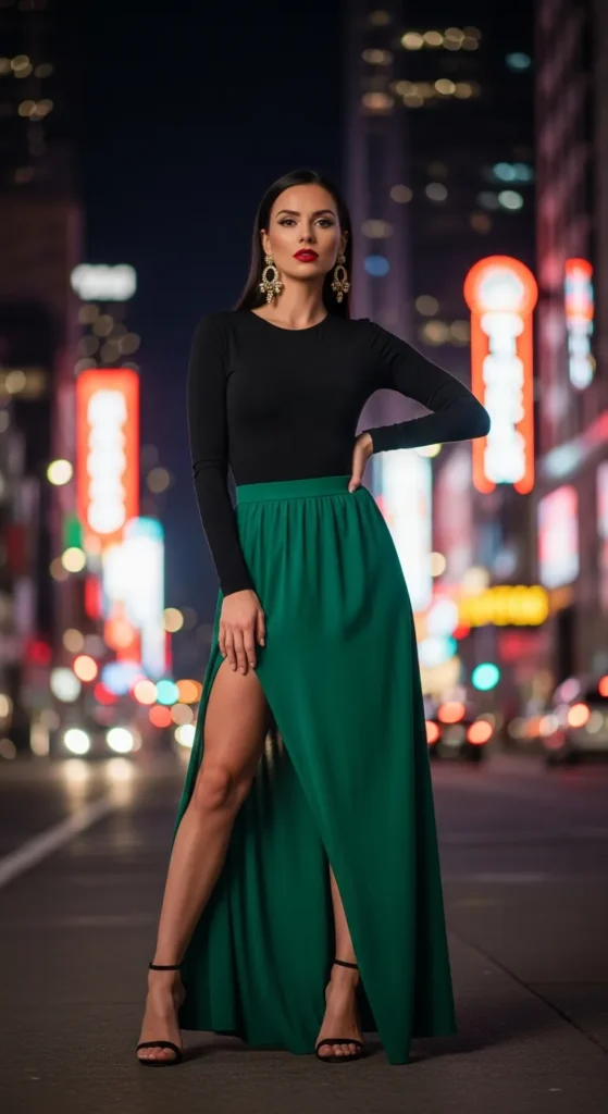 A high-slit maxi skirt paired with a fitted bodysuit creates a bold, confident look. It balances elegance with a hint of edge, making it perfect for evenings.