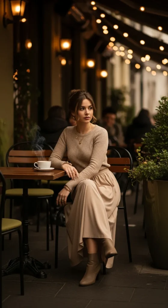 A soft neutral-toned maxi skirt paired with a fitted knit top creates a calm, understated elegance. The textures work together to feel cozy yet polished.