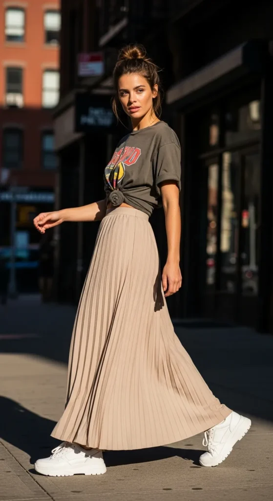 A structured pleated maxi skirt paired with a relaxed graphic tee creates a playful balance between elegance and casual style. It’s an easy way to dress down a formal piece while still looking styled.