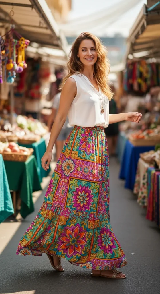 A bold printed maxi skirt paired with a simple sleeveless blouse lets the skirt shine while keeping the outfit balanced. It’s lively, expressive, and perfect for bright summer days.