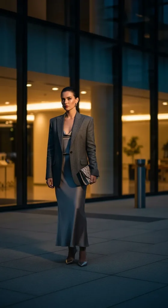 A silky maxi skirt combined with a structured blazer creates a powerful yet feminine outfit. It blends softness with authority, making it perfect for dressed-up moments.