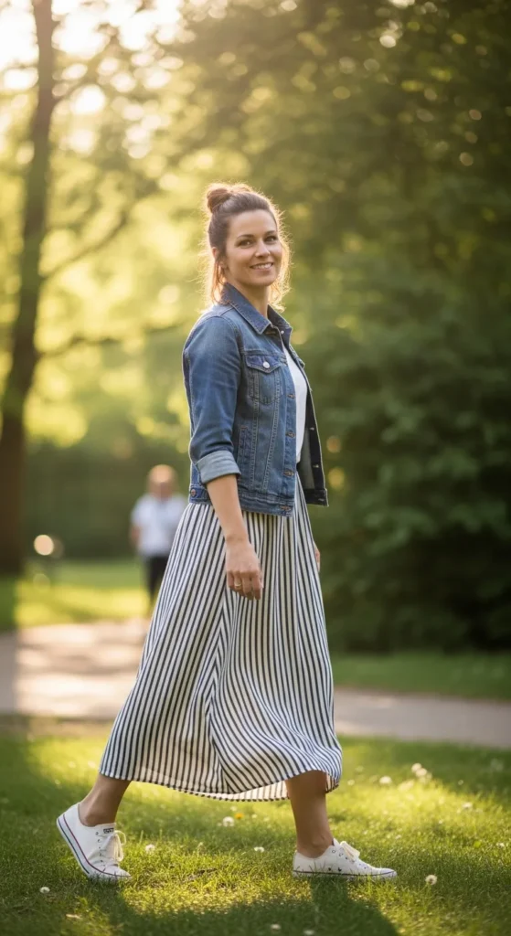 A striped maxi skirt layered with a classic denim jacket creates a playful yet grounded outfit. It’s versatile and works well for casual outings or weekend plans.