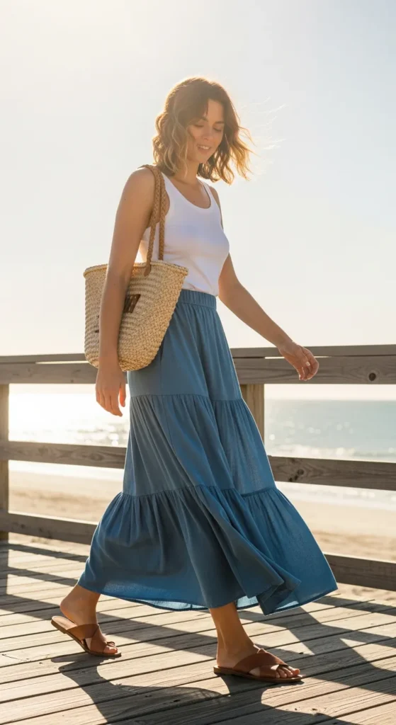 A tiered maxi skirt styled with a basic tank top and flat sandals feels carefree and relaxed. The layered skirt adds movement, making it ideal for warm, sunny days.
