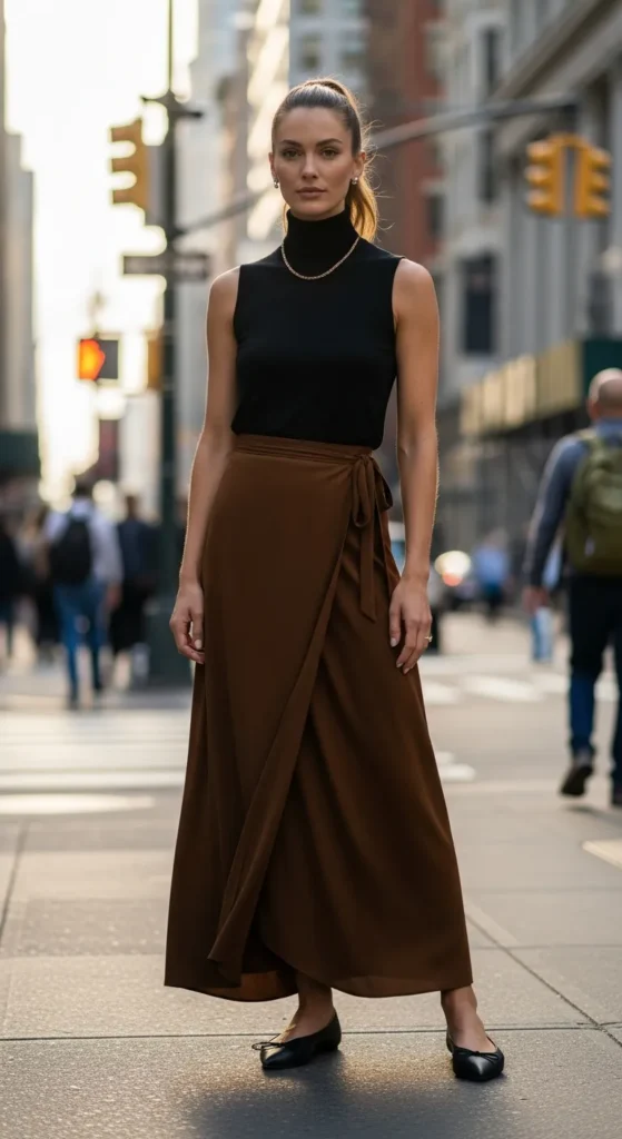 A wrap-style maxi skirt styled with a sleeveless turtleneck offers a sleek, sculpted look. It defines the waist while keeping the outfit modern and streamlined.