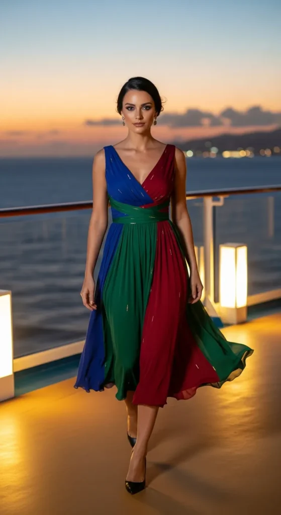 A colorblock midi dress offers a modern twist with bold contrasts, perfect for standing out during dinner nights onboard.