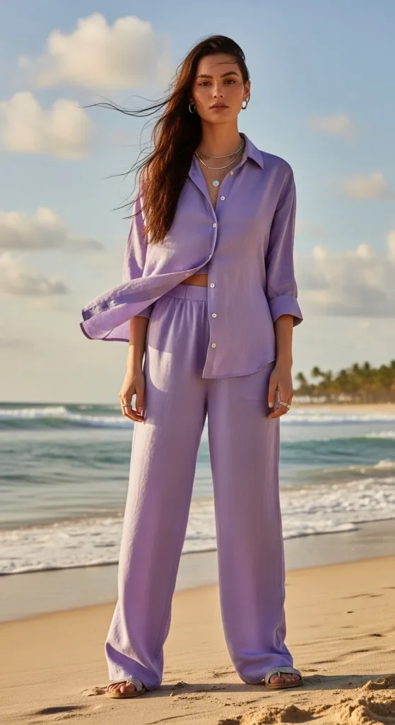 A soft lavender linen set feels airy and calming, perfect for warm afternoons by the sea. The subtle color adds elegance without losing that playful vacation feel.