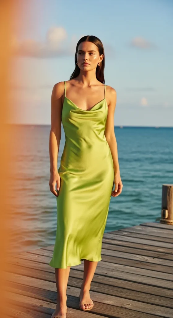 A lime green slip dress is bold yet minimal, making it perfect for standing out while staying cool in the tropical heat.